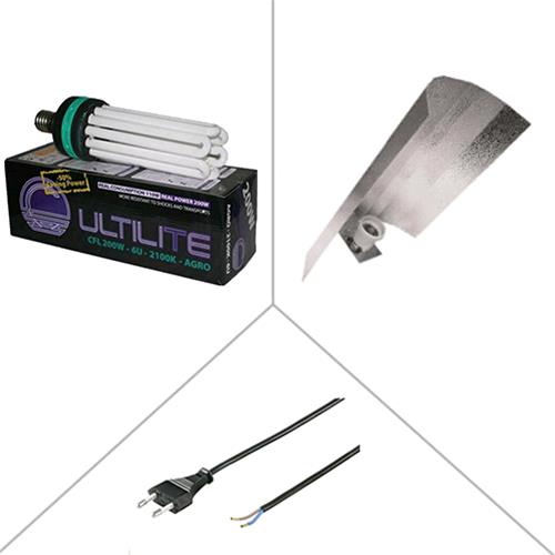 Kit di illuminazione composto da lampada cfl basso consumo Cultilite 200W agro 2100k Black Series, adatto per entrambe le fasi vegetativa\fioritura, schermo riflettente, cavo e spina. Visto il forte peso delle lampade cfl, il kit viene fornito con schermi rigidi stuco e staffa rinforzata, in modo da sostenere senza alcun problema la lampada.